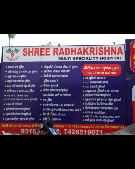 "Shree RadhaKrishna one of the best hospitals in palam , with all the medical facilities available 24 hours. One place for all your medical treatments in palam, We have all kinds of facilities be it pathology, Pharmacy, IPD, X-RAY, Orthopedics, ICU, Emergency we are always here for you."